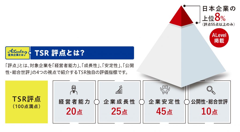 東京商工リサーチ社が企業の特徴、業績、財務内容、経営理念などを取材し、 「経営者能力」、「企業成長性」、「企業安定性」、「公開性・総合世評」を総合的に算出したのが「TSR 評点」と呼ばれ、 この評点は企業と取引する一つの基準として、金融機関、商社、メーカー等の民間企業から公共機関まで幅広く活用されており、 TSR評点が55点以上の会社を「Aランク企業」として認定しています。